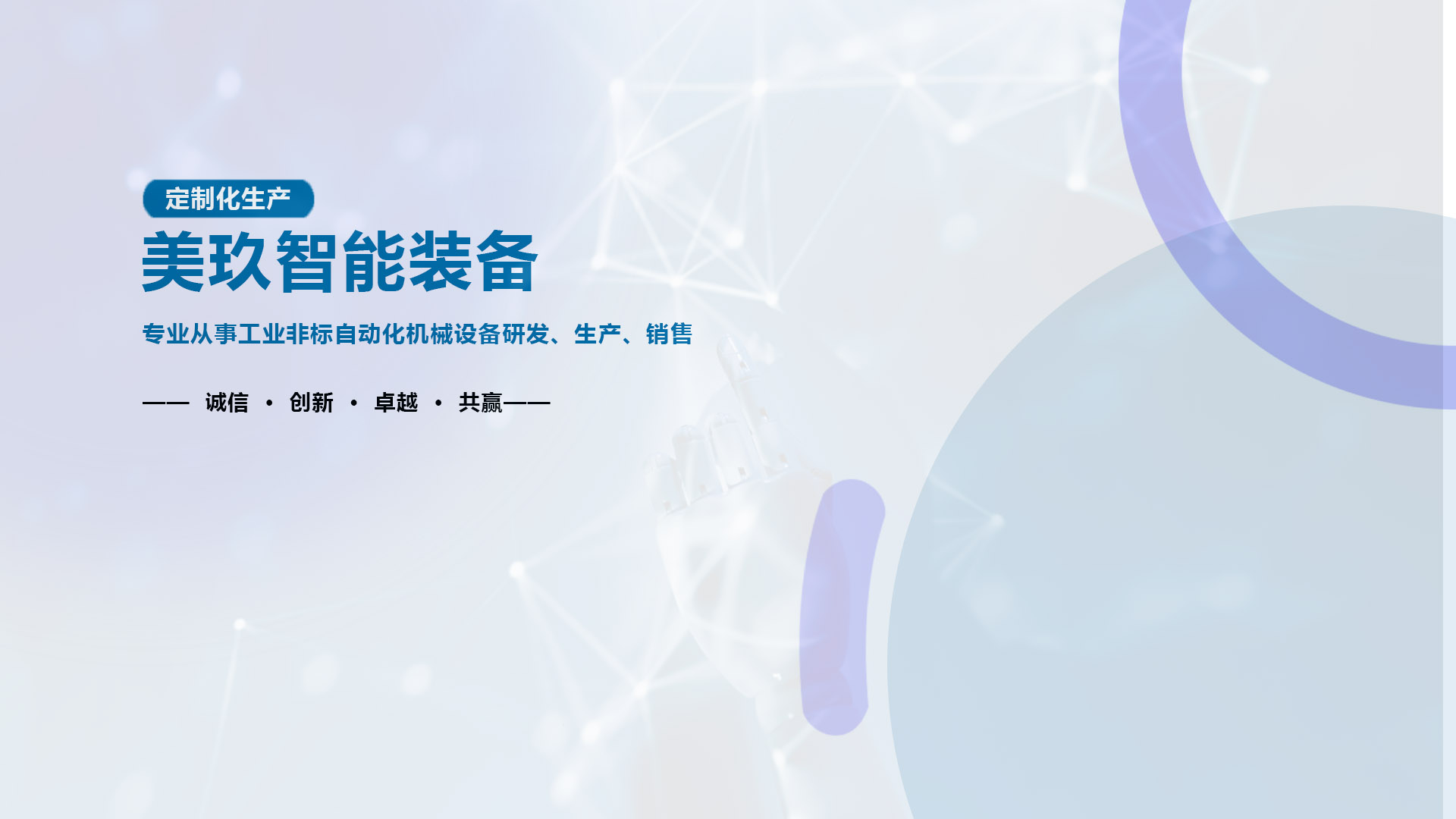 宁波市美玖智能装备有限公司专业从事工业非标自动化机械设备研发、生产、销售,成立于2014年4月,拥有一支25人技术力量雄厚的设计、组装、调试的团队,其中,机械设计师8名,电气工程师2名,安装调试技术人员15名。公司致力于解决并实现高效率、高品质、低成本、全自动化生产作业,为各行企业节约资源、提高效益,实现社会、客户和谐共赢。经营项目:专注于开发及生产汽车零件件的自动化生产线专注于开发及生产医疗产品的自动化生产线专注于开发及生产继电器的自动化生产线专注于开发及生产各种开关和插座的自动化生产线专注于开发及生产温感,烟感等消防报警器产品的自动化生产线定制化生产:根据不同客户的需求开发不一样的全自动化机器